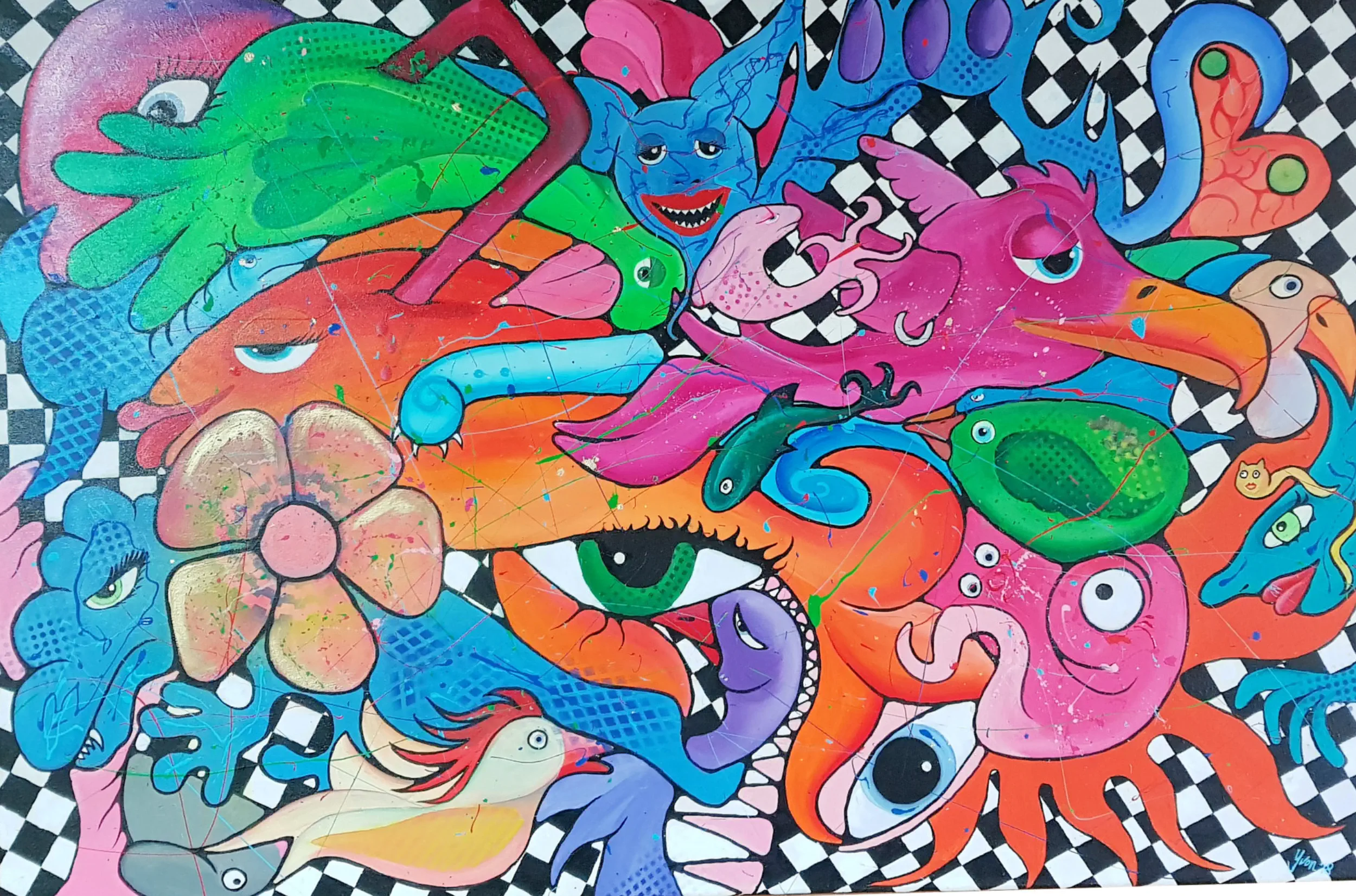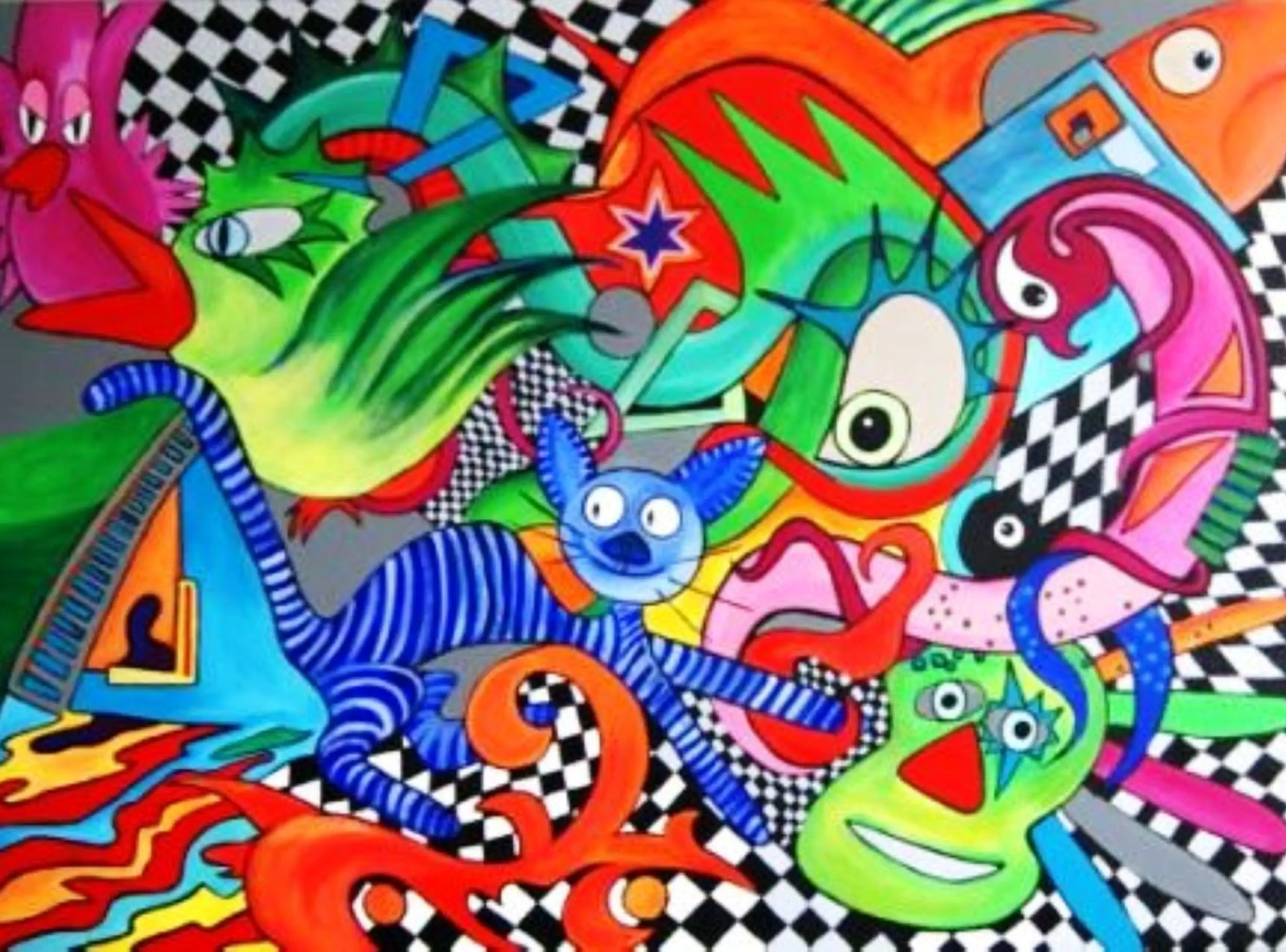 Verder werk ik graag met een bonte mix van kleuren en humor. Hier gebruik ik